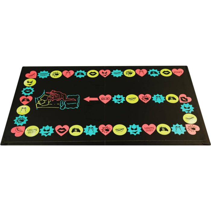 Foreplay actions spaces change based on if you are playing with the lights on or if you're in the dark. The first person to reach the end of the game path wins a sex position by using the colourful game spinner.