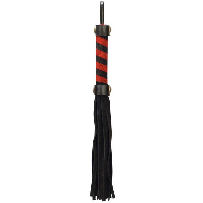 The Whip with Black Handle has a wound leather handle with silver rivets closing the top and bottom and is available in a variety of colours. Flogger is leather. Loop at top to hang up when not in use.